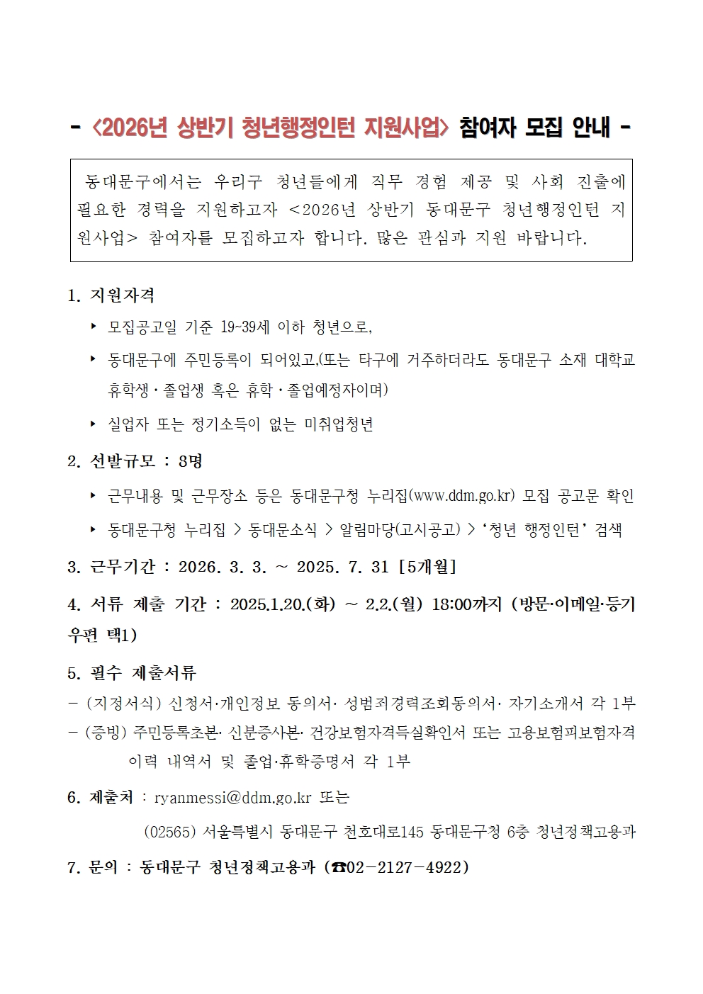 [모집] 동대문구청 2026년 청년 행정인턴 지원사업