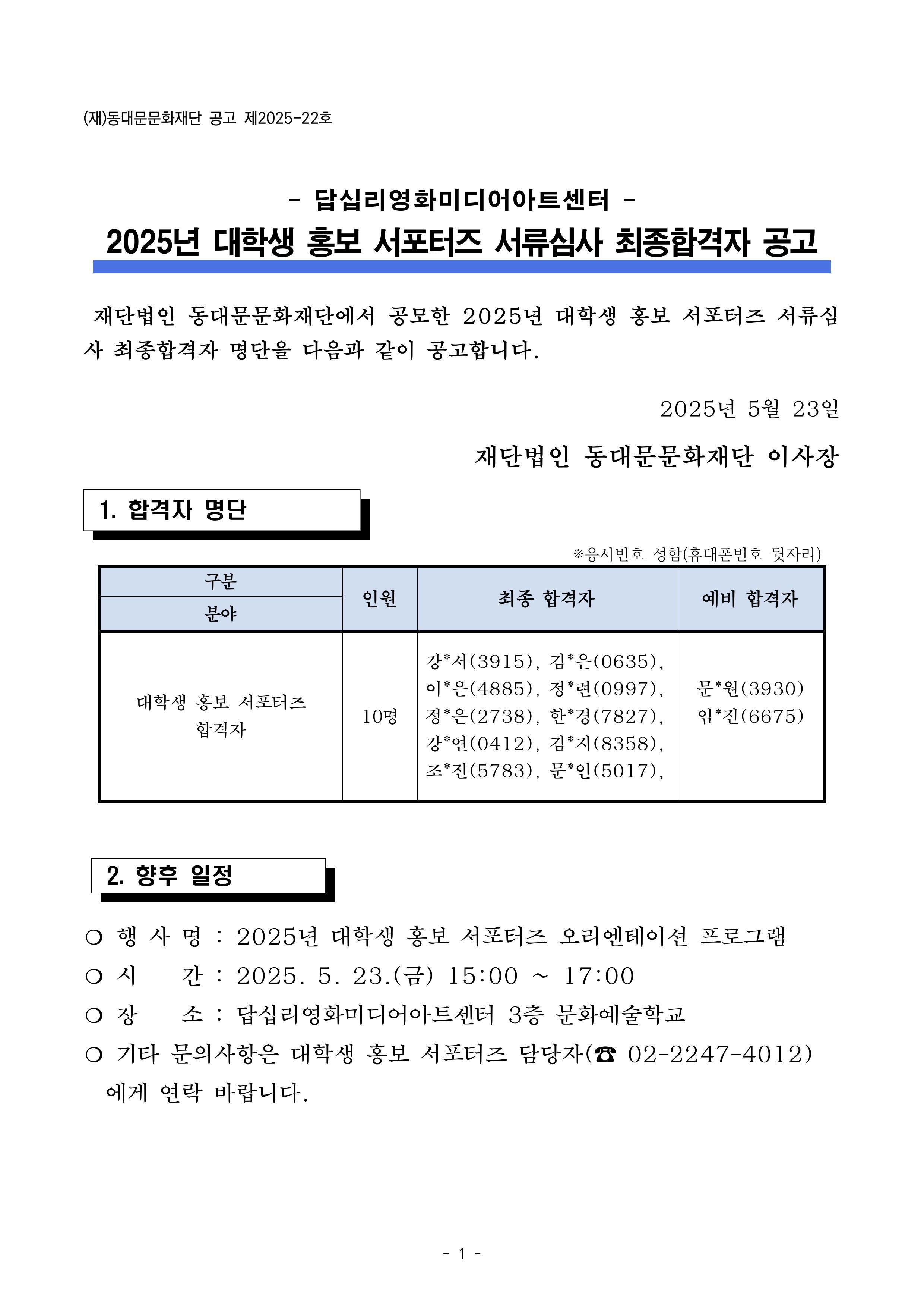 [서포터즈 모집결과] 2025년 대학생 홍보 서포터즈 서류심사 최종합격자 공고