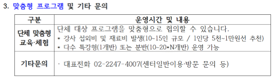 그밖에 단체 맞춤형 체험프로그램은 내선으로 문의해주시면 응대해 드리겠습니다^^